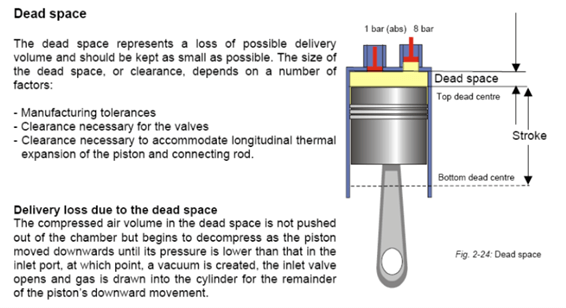 ทั้งนี้ผู้อ่านอาจจะส่งสัยว่าทำไม name plate เขียนไว้ว่า เครื่องสามารถทำ Displacement ได้ ที่ 1,450 m3/min แต่ทั้งนี้ทั้งนั้น ปั๊มลมแบบลูกสูบนั้น มีระยะการชักของกระบอกสูบแบบไม่เต็ม 100% เราเรียกมันว่า Dead space ซึ่งระยะชักของกระบอกสูบไม่สามารถขึ้นสุดลงสุดได้