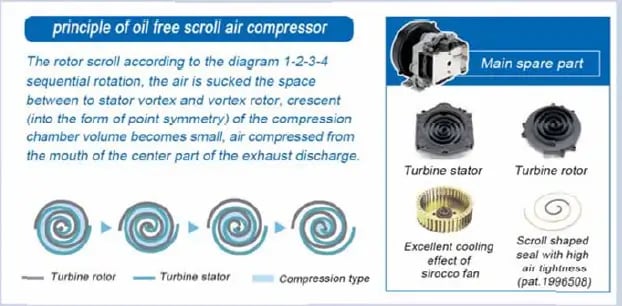 หลักการทำลม คือ Scroll ประกอบด้วย 2 ชิ้นส่วน Rotor รูปเกลียวขดม้วนที่เชื่อมต่อกัน นั่นคือตัวหมุนตัวหนึ่งอยู่กับที่ และ Rotor อีกตัวมีมอเตอร์ขับเคลื่อนให้หมุนเป็นวง rotor จะแกว่งอย่างต่อเนื่องโดยไม่มีโลหะสัมผัสกัน ขณะที่อากาศถูกอัดเข้าเป็นปริมาตรที่เล็กลงเรื่อย ๆ เป็นกระเปาะอากาศรูปร่างจันทร์เสี้ยว เรามาศึกษาเพื่อทำความเข้าใจกลไกของการบีบอัดแบบปริมาตรแทนที่ในเครื่องอัดอากาศประเภท Scroll rotor หมุนเป็นวงได้รับการขับเคลื่อนโดยเพลาข้อเหวี่ยงช่วงชักสั้นและหมุนเยื้องรอบ ๆ ศูนย์กลางของตัวหมุนคงที่ การเคลื่อนที่ของrotor จะสร้างแรงดูดที่จะดูดอากาศเข้ามาทางช่องรับอากาศที่ด้านบนของเฮาส์ ซึ่งอากาศหรือก๊าซที่ถูกจับอยู่ในกระเปาะอากาศระหว่าง 2 rotor จะค่อย ๆ ถูกบีบอัดขณะที่เคลื่อนเข้าสู่ตรงกลางของเฮาส์ซึ่งที่มีพอร์ตขาออกและวาล์วป้องกันการไหลย้อนกลับ ก๊าซที่ถูกบีบอัดและมีแรงดันจะถูกปล่อยออกจากพอร์ตขาออกตรงกลางของเครื่องอัดอากาศหรือเครื่องปั๊มลมชนิดนี้ วาล์วป้องกันการไหลย้อนกลับหรือวาล์วกันกลับจะป้องกันไม่ให้ก๊าซหรือสารทำความเย็นไหลย้อนกลับ