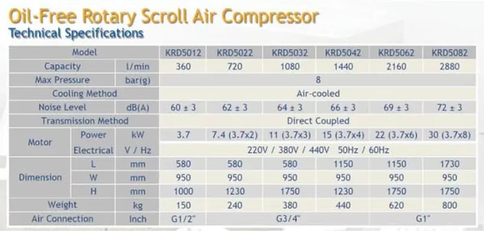 ปั๊มลมแบบไร้น้ำมัน Delta Scroll Air Compressor ขนาดของปั๊มลมมีขนาดตั้งแต่ 3.7 – 30 kw หรือ 5 – 40 HP