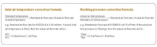 หรือ การคำนวณอย่างง่าย (ที่อุณหภูมิอยู่ที่ 35-39 องศาเซลเซียส) คือ ปริมาณลมต้นกำลัง X 1.5 = ขนาดปริมาณลมที่ Air Dryer ที่ควรเลือกใช้